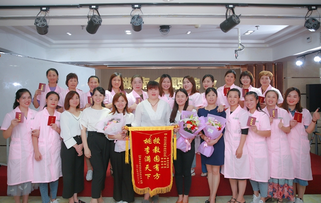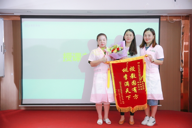 结业典礼的最后,学员们为老师们送上鲜花和锦旗,互相拥抱,并以一首手语舞《感恩的心》表达对学校及老师的不舍之情。任课老师为学员们颁发结业证书,至此,322期催乳师班全体学员正式毕业!