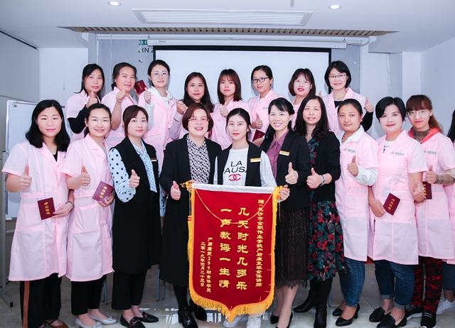 随后,本期产后康复班主讲老师曾醒晨讲道:“学员们的信任也给予了自己极大的信心,非常感谢学员们这段时间的努力,希望大家都有个美好的前程!”言简意赅但情深意真。令人感动的是,学员们特意为老师准备了锦旗,“几天光阴几多乐,一声教诲一生情”,短短两句话表达了学员们对老师的感恩之情。