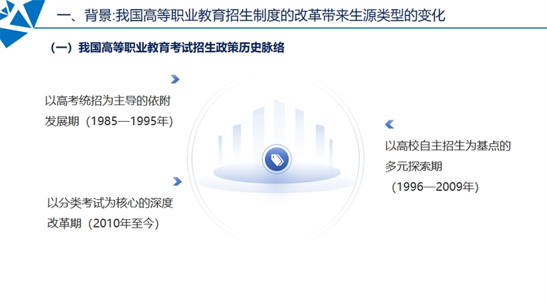 王燕回顾了我国高等职业教育考试招生政策的变化,并总结了高职招考制度的改革趋势。她谈到,自2010年以来,高职院校生源呈现多元化,涵盖普通高中生、中职生、社会再就业者、退役军人等群体,这使得高职院校兼具社会服务与继续教育的功能,满足多层次职业发展需求。