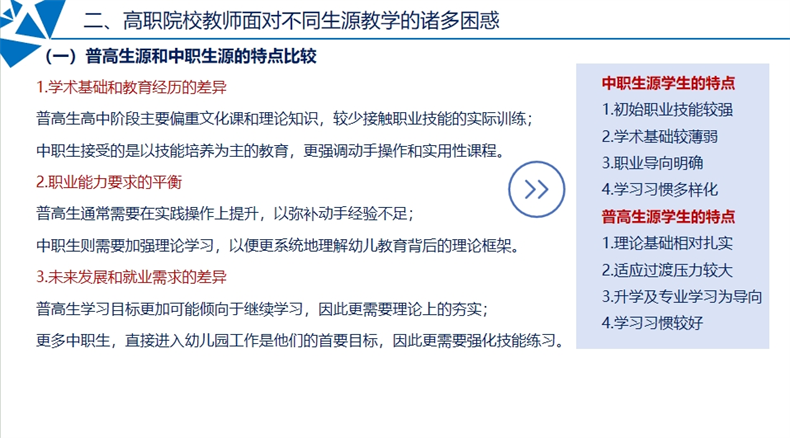 最后,王燕副教授还强调了针对不同生源学生提供不同心理支持的重要性。例如,对于普通三年制班的学生,可通过小组展示和比拼激发学习兴趣;而对于中职生源班,则可通过项目式教学,如策划幼儿园活动,展示实操技能,帮助他们获得成就感,从而激发内在学习动力。