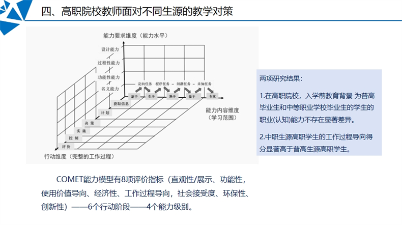 面对不同生源带来的教学挑战,王燕副教授提出了几点对策。首先,她强调教师应正确评价两种生源的学生,采用基于真实工作任务的测评与评价方式,替代传统的理论知识测验与碎片化测评。通过引入COMET能力模型进行测评,研究发现,在高职院校中,普高与中职两种生源学生的职业(认知)能力并无显著差异,而中职生源学生的工作过程导向得分甚至高于普高生源。