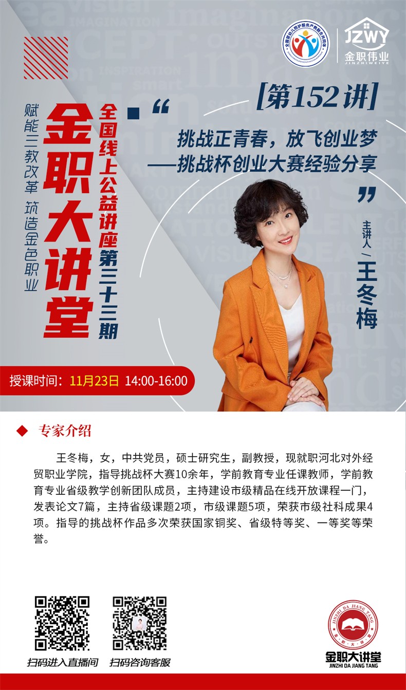 11月23日,金职大讲堂将开启第三十三期第152讲,课程将邀请河北对外经贸职业学院王冬梅副教授,进行《挑战正青春,放飞创业梦——挑战杯创业大赛经验分享》主题授课。