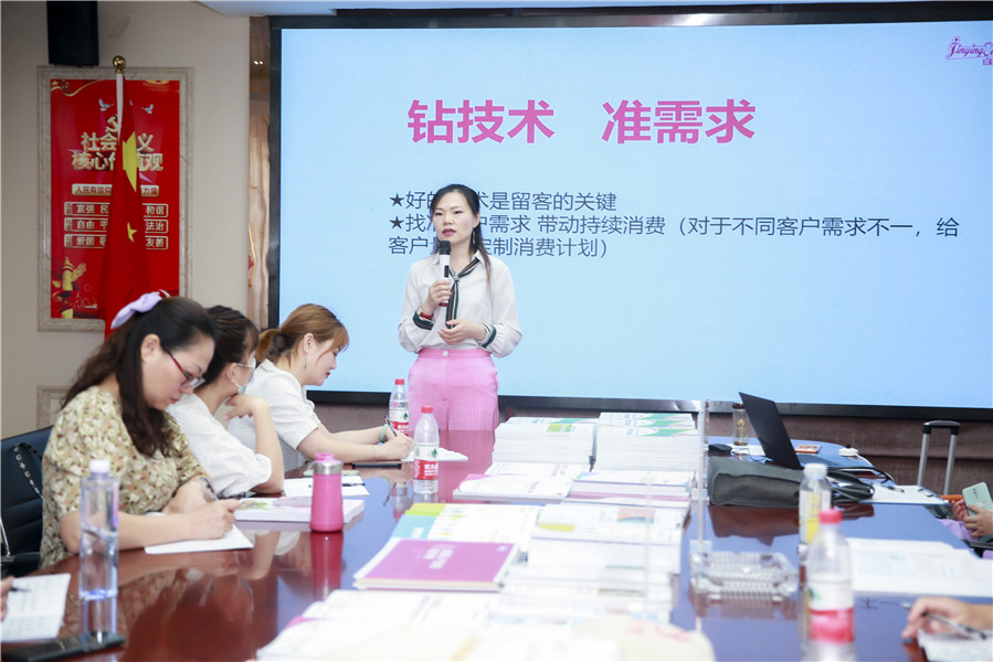 据了解,本次培训为期两天,以培养优秀销售人才队伍,拓宽门店发展渠道为总体目标,课程涉及品牌建设、门店运营及管理、销售技巧等多个版块,有金婴丽人全国门店运营经理邱艳带来的《如何让门店在当下具备核心竞争力》《店务管理的核心要点》《销售心法八窍法则》《包装与塑造(升级版)》等课程内容,旨在以多领域的专业知识,培养全方面的综合性人才;有深圳安馨堂生物科技有限公司官方合伙人、体脂管理师、低碳饮食减脂管理师夏小涵带来的《门店业绩收入倍增模式》的课程,给各位学员们提供了增长门店业绩的新思路、新做法;有乐普医疗市场经理孙群带来的《新时代互联网“+”产康》的课程,主要讲解了盆底肌仪器的使用方法,以帮助学员掌握仪器操作方式,提升门店服务水平。