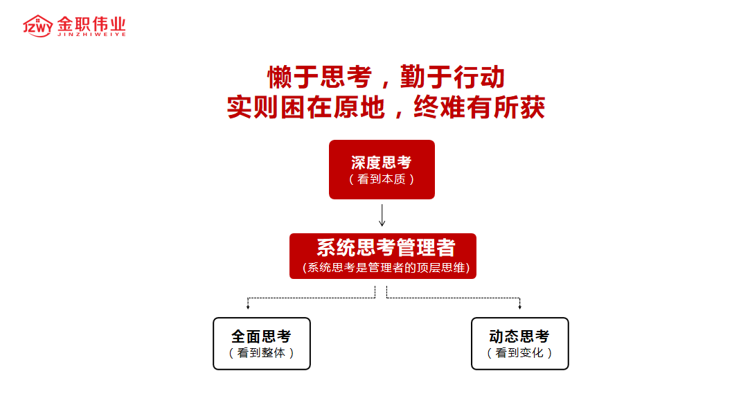 系统思考是管理者的顶层思维,学会系统思考,从而成为系统思考管理者。即通过深度思考,看到本质;通过全面思考,看到整体;通过动态思考,看到变化。