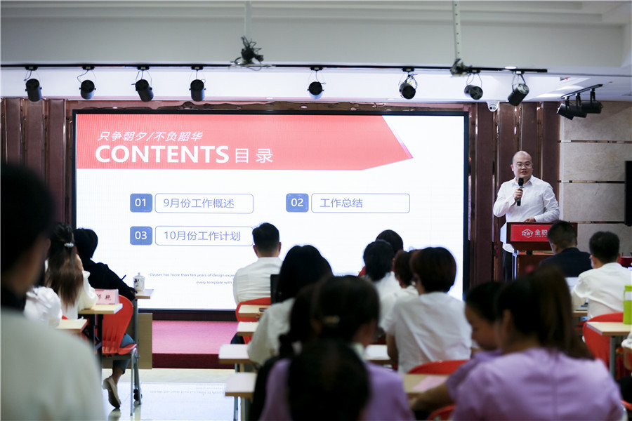 随后,综合部、市场部、外联部、发展事业部、直营门店及门店运营部、品牌运营及商学院各部门负责人,依次上台进行汇报,系统地对上月工作进行总结,并科学部署下一步重点工作。与此同时,各部门员工代表针对九月工作情况进行经验分享。