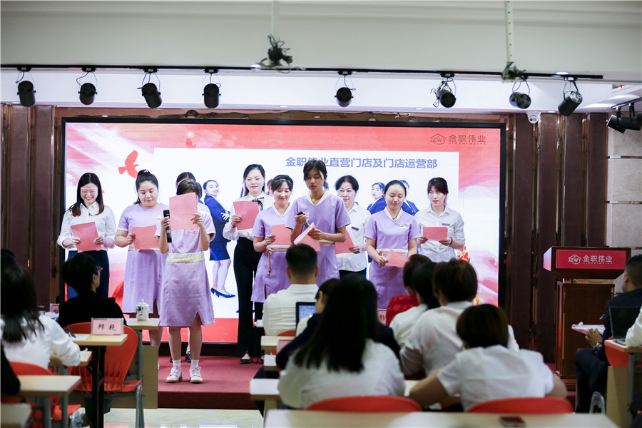 祖国是最坚实的后盾,是最安心的栖息之所,是我们华夏民族至高无上的骄傲,在这举国欢庆的时刻,综合部带来《国庆一一献给亲爱的祖国》诗歌朗诵,深切表达了对祖国母亲的崇敬与热爱之情。作为业绩部门,市场部全员斗志满满、蓄势待发,以“万众一心,众志成城”为精神,以“努力奋斗一百天,拿下最终胜利”为目标,进行最后的宣誓,致力让公司业绩更上一层楼。品牌运营及商学院以梁启超先生的《少年中国说》为主题,歌颂了少年的朝气蓬勃,旨在鼓舞、激励全体员工积极进取,主动作为,不断提升自我价值。“在金职发展新的征程上,让我们擂响创新的战鼓,高扬奉献的旗帜,昂首阔步完成年度目标……”一字一句,雄心勃勃,充分体现了外联团队坚守岗位,为公司不断付出,做好服务的奉献精神。发展事业部慷慨激昂、振奋人心的目标口号,直营门店及门店运营部充满朝气、能量满满的歌曲演唱,更是彰显了金职团队的无穷力量。