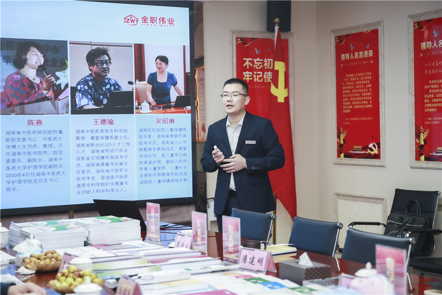 座谈会上,金职伟业市场总监周该生对公司的组织架构、经营模式、核心项目及幼儿照护、产后恢复职业技能等级证书试点工作取得的成果做了详尽介绍。