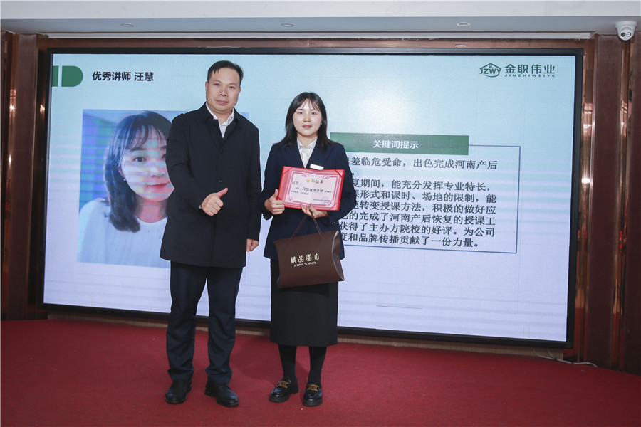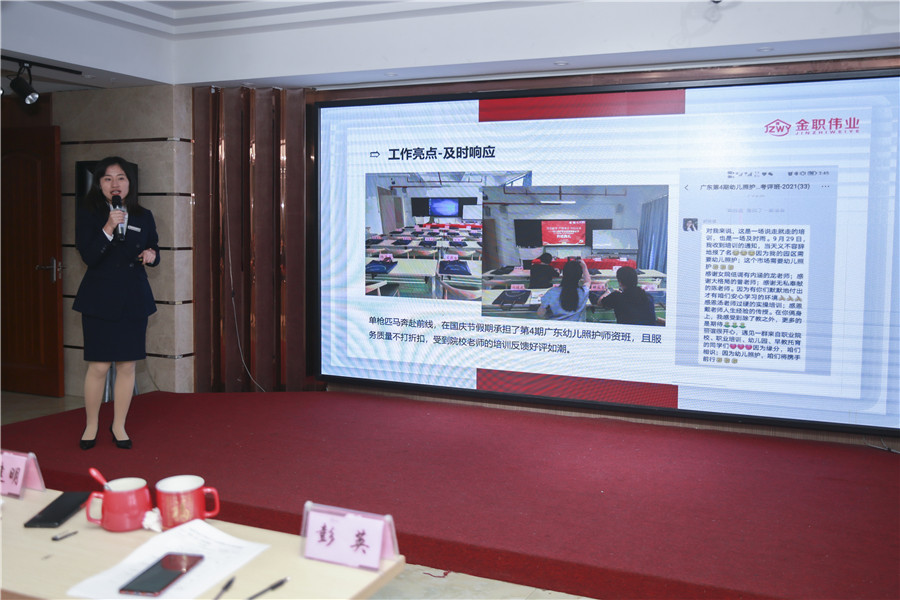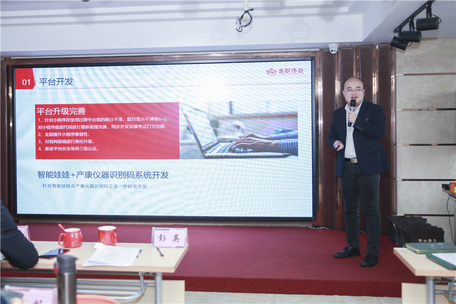 最后,金职伟业总经理潘建明从1+X幼儿照护及产后恢复证书试点工作、产教融合、品牌宣传等九大方面,对下一步的工作进行了具体安排。他提出,1+X幼儿照护、产后恢复职业技能等级证书制度试点工作已颇有成效,之后,希望全体员工能够抓紧时间,相互协作,严格考评,加强媒体宣传力度,携手更多院校打造典型案例,共创美好未来。