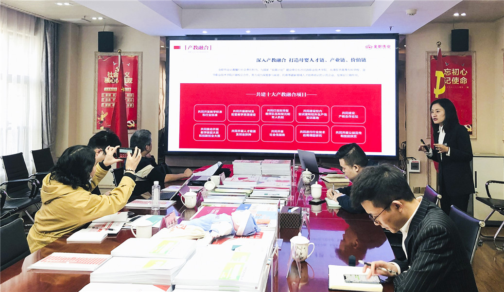座谈会上,金职伟业董事长助理兼品牌运营总监周娟就公司整体战略布局、公司荣誉、业务版块发展具体情况以及在1+X证书推进工作中取得的成果作了详细介绍。