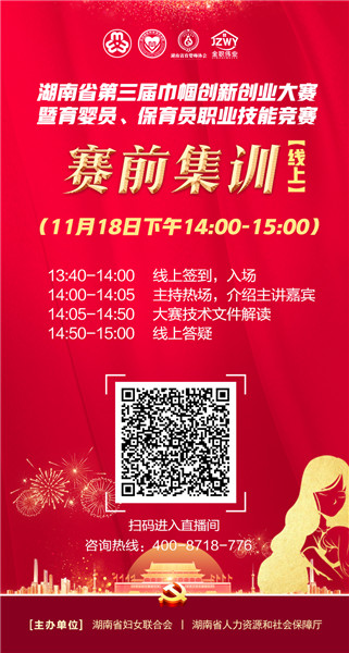 为助力我省参赛选手在比赛中取得好成绩,11月18日下午14:00-15:00,大赛组委会将以线上直播的方式开展湖南省第三届巾帼创新创业大赛暨育婴员、保育员职业技能竞赛赛前集训,特邀专家作大赛技术文件解读及答疑。