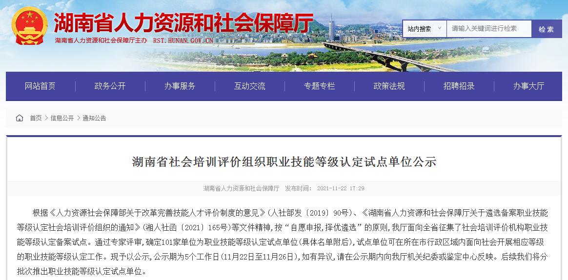 据悉,为贯彻落实《人力资源社会保障部关于改革完善技能人才评价制度的意见》(人社部发〔2019〕90号)、《湖南省人力资源和社会保障厅关于遴选备案职业技能等级认定社会培训评价组织的通知》(湘人社函〔2021〕165号)等文件精神,按“自愿申报、择优遴选”的原则,通过专家评审,湖南省人力资源和社会保障厅正式确定101家单位为职业技能等级认定试点单位。金职伟业充分发挥自身在母婴、护理领域深耕多年的经验优势,积极申报,成功入选为保育师、养老护理员职业技能等级认定试点单位,接下来,可正式开展相应等级的职业技能等级认定工作。