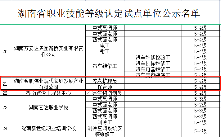 近日,湖南省人力资源和社会保障厅下发《湖南省社会培训评价组织职业技能等级认定试点单位公示》,湖南金职伟业现代家庭发展产业有限公司(以下简称“金职伟业”)等101家机构入选为湖南省社会培训评价组织职业技能等级认定试点单位。