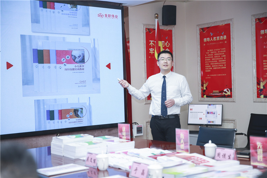 座谈会上,金职伟业市场运营总监周该生对公司的组织架构、经营模式、核心项目及幼儿照护、产后恢复职业技能等级证书试点工作取得的成果做了详尽介绍。