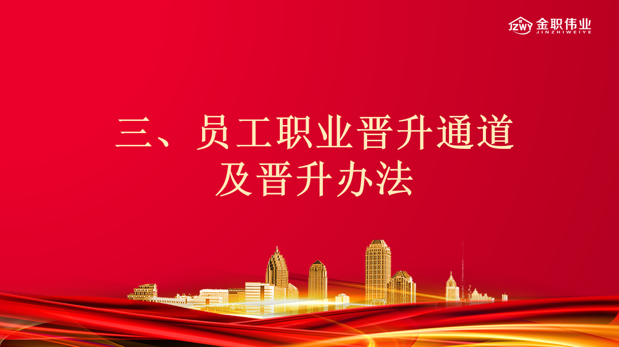 员工是公司的宝贵财富和创新的源泉,职业发展管理对员工至关重要。金职伟业将人才培养放在第一位,不仅为员工提供了丰厚的薪酬和福利待遇,更是将员工的培训与发展视为公司的重要目标之一,明确的晋升机制将员工个人职业生涯与企业命运紧紧相连,让员工感受到企业的人文关怀,激发员工干劲,创造个人最大价值。为此,金职伟业为员工设计了纵向发展、横向发展、多重阶梯的职业发展道路。