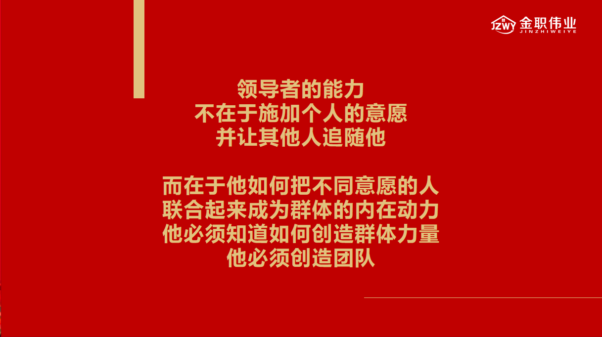 领导者的能力,不在于施加个人意愿,要求他人追随,而在于他如何把不同意愿的人,联合起来成为群体的内在动力,他必须知道如何创造团队,创造群体力量。领导者的作用不在于做垄断性决策,要求他人绝对服从,而是要协调团队成员的长处和短处,灵活运用,让团队成员对团队、对企业有归属感、有向心力,在任务下达后能凝心聚力,拧成一股绳,发挥1+1>2的作用,让工作不仅是工作,更是个人价值的风向标。