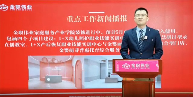 金伟业集团有限公司总经理助理兼院校事业部总监周该生作为主持人就近期工作作了简单汇报,其中,他重点提及幼儿照护、产后恢复、医养个案管理、健康财富规划职业技能等级证书试点申报情况,“幼儿照护、产后恢复、医养个案管理、健康财富规划证书截至2022年4月28日,已完成申报省份14个,正在申报省份13个,待申报省份4个,共计申报人数为12.5万人。”