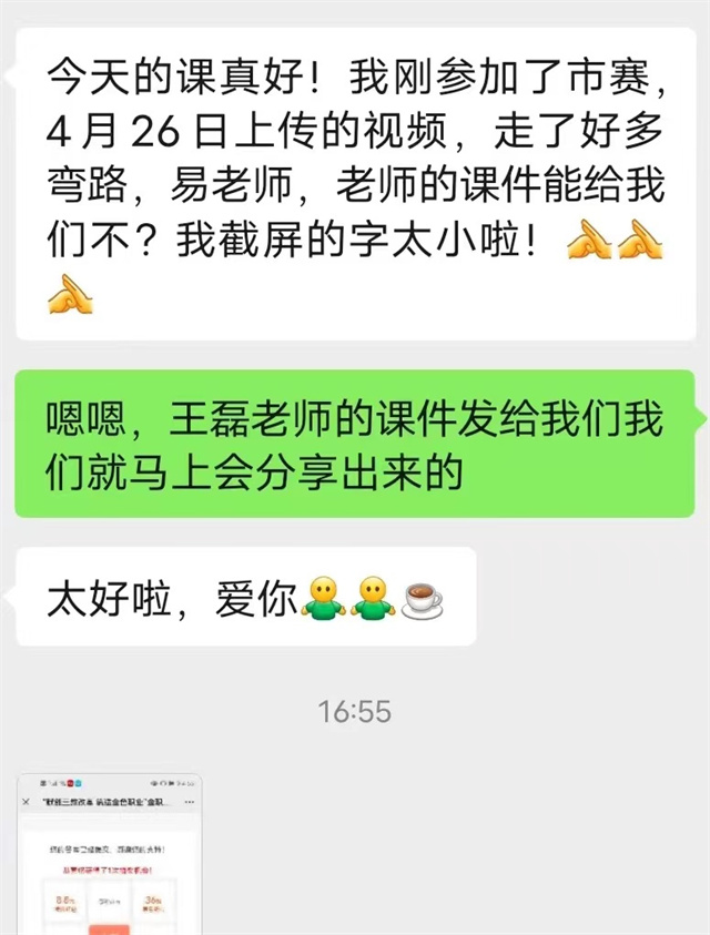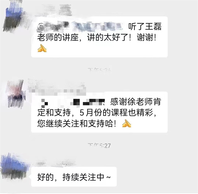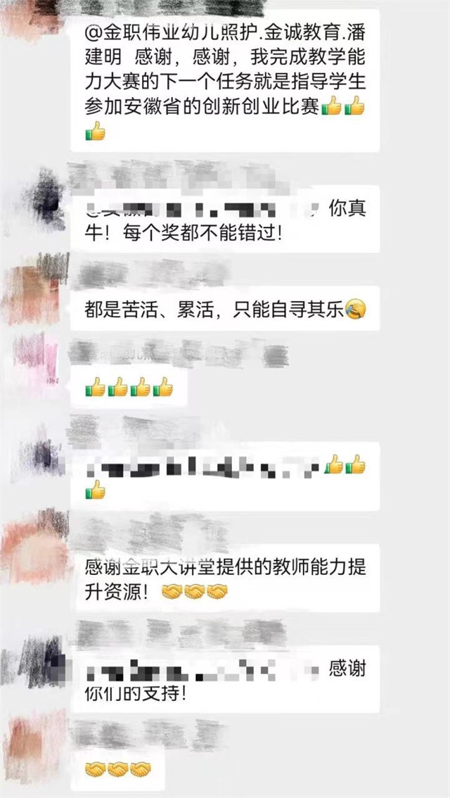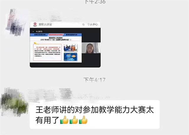 课程结束后,参训老师们纷纷表示此次课程内容精彩,干货满满,“此次课程教学内容明晰,给了我许多参赛灵感。”“感谢金职大讲堂提供的教师能力提升资源!”“之前参加比赛走过很多弯路,此次王磊老师的分享让我受益匪浅!”“老师的课程太有用了,希望金职大讲堂越办越好。”