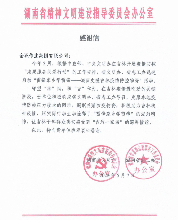 湖南省精神文明建设指导委员会办公室发来感谢信,点赞金职伟业驰援吉林抗疫