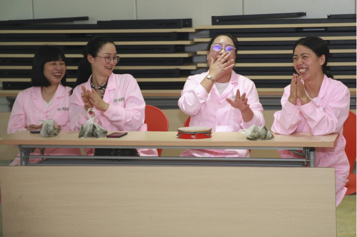 6月2日,育婴班结业,恰逢端午节,班主任组织大家在结业典礼上吃粽子、玩“击鼓传花”游戏,已彻底走出阴霾张春阳越来越开朗自信,喜悦之情溢于言表。(图1第二排左2、图3右1为张春阳)