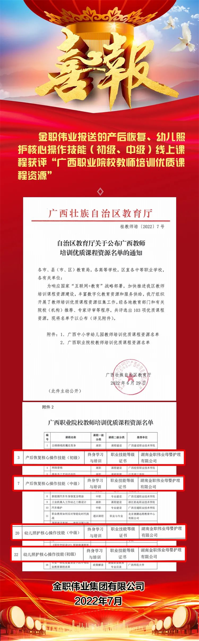 1.喜讯|金职伟业报送的产后恢复、幼儿照护核心操作技能(初级、中级)线上课程获评广西壮族自治区省级职业院校教师培训优质课程资源
