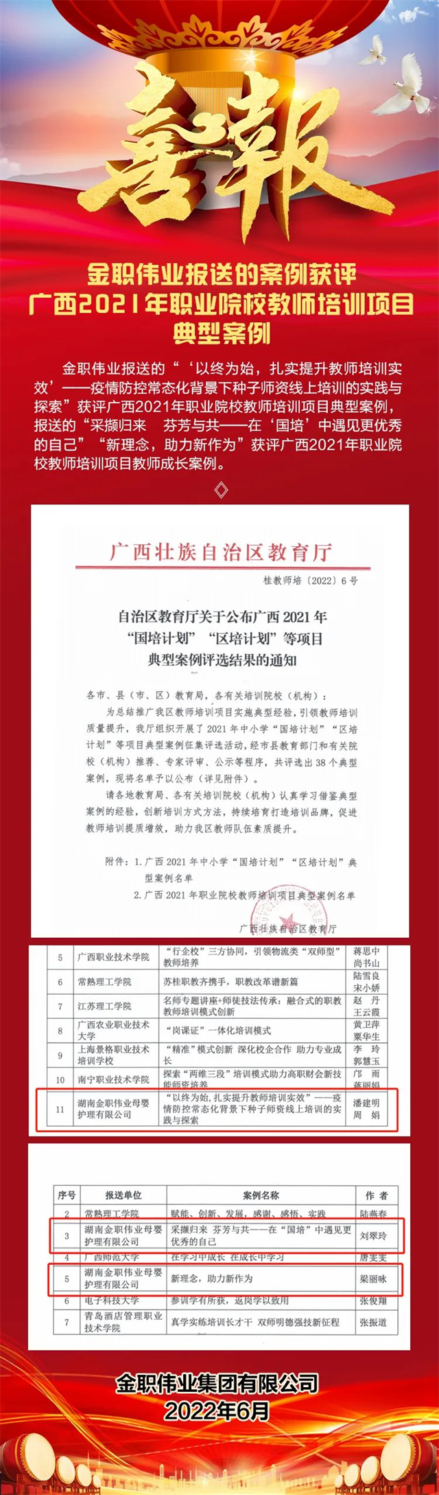近日,广西壮族自治区教育厅发布《关于广西2021年“国培计划”“区培计划”等项目典型案例评选结果的公示》,金职伟业报送的“‘以终为始,扎实提升教师培训实效’——疫情防控常态化背景下种子师资线上培训的实践与探索”等3项案例,获评广西2021年职业院校教师培训项目典型案例。
