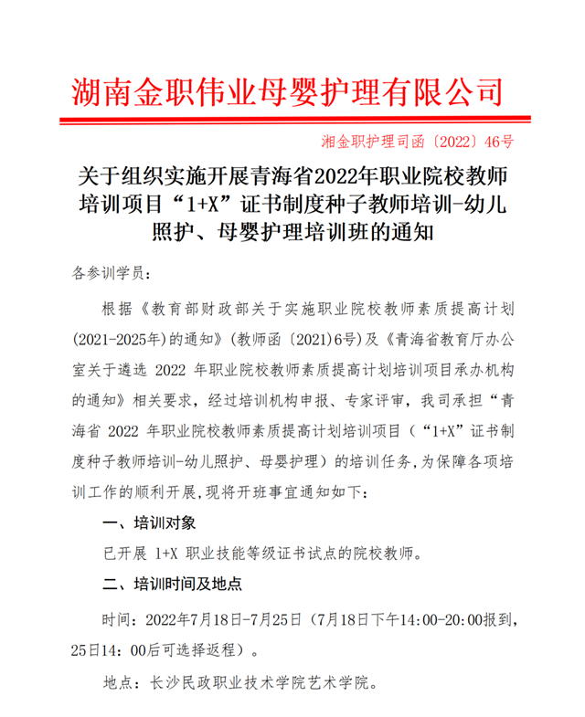 1.(湘金职护理司函〔2022〕46号)关于组织青海2022职业院校教师培训项目1+X证书制度种子教师培训幼儿照护、母婴护理培训通知