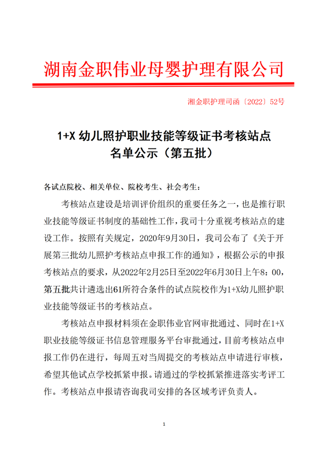 2.(湘金职护理司函〔2022〕52号)1+X幼儿照护职业技能等级证书考核站点名单公示(第五批)