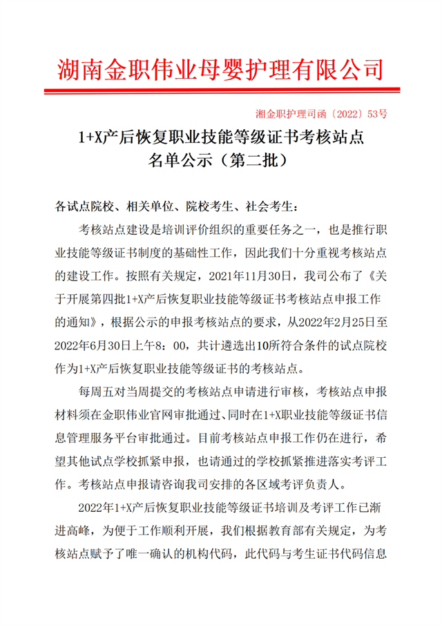 3.(湘金职护理司函〔2022〕53号)1+X产后恢复职业技能等级证书考核站点名单公示(第二批)