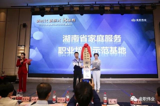 会上,湖南省就业服务局农村就业处主任毛彪先生为湖南金职伟业公司颁发了“湖南省家庭服务职业培训示范基地”荣誉牌匾,金职伟业董事长彭英女士上台接受牌匾。