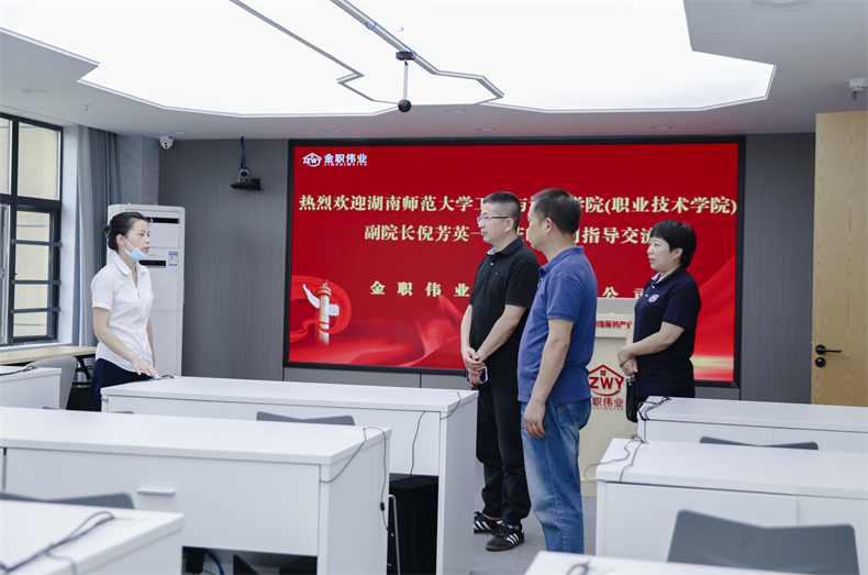 9月7日,湖南师范大学工程与设计学院(职业技术学院)副院长倪芳英一行莅临金职伟业交流指导,金职伟业集团总经理潘建明热情接待,双方就如何找准切入点、开展校企合作、共同培育师资等展开了深入交流。