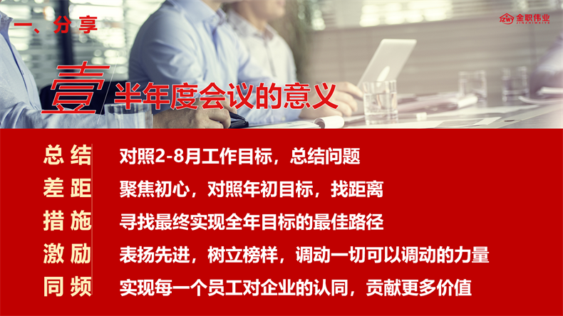 在当前极其艰难的形势下,企业要生存,员工要发展,更需要业绩的支撑。业绩为王,金职伟业2022年度的目标势必要达成,这是所有金职人的任务与使命,要寻找一切可寻找的路径,想尽一切可想的办法,存量增量两手抓,死守存量,拓展增量。