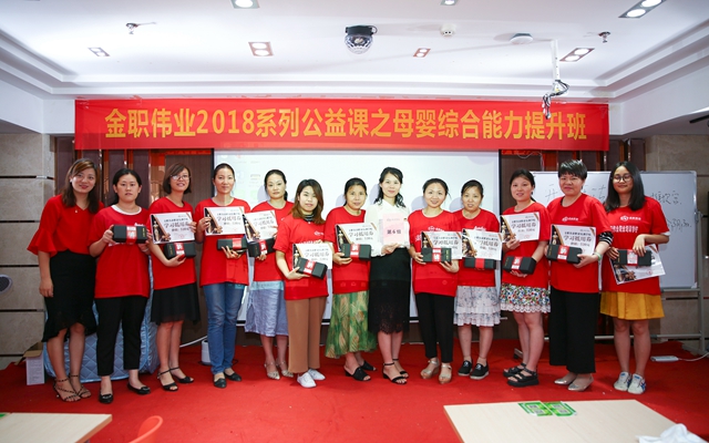 金职伟业母婴综合能力提升班秉着公益助贫的宗旨,传授母婴服务范畴含母婴护理、催乳、产后康复、小儿推拿、育婴早教在内的综合技能,帮助女性从母婴行业小白进阶为新型母婴技能综合人才。金职伟业培训学校陈波校长表示,学校从创立至今,积极投身于公益培训工作,此次母婴综合能力提升班是对公益课程的一次探索,取得了非常不错的反响,今后将持续举办此类活动,助力女性就业创业。