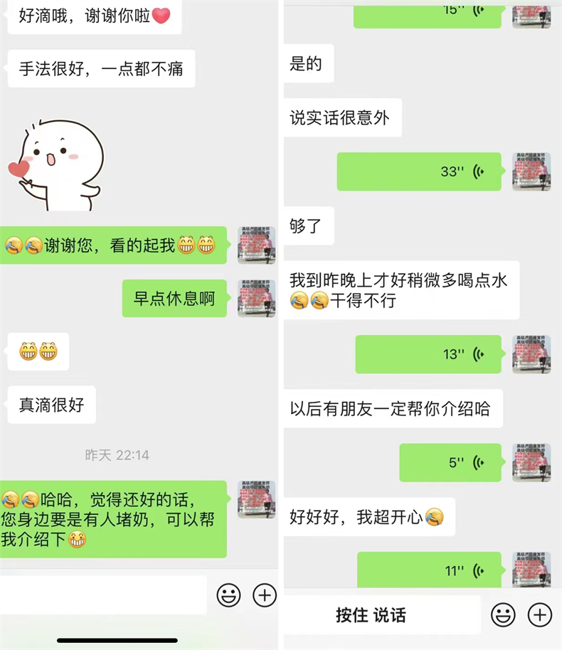 说干就干,产后的第二个月,陈艳林就开始了上门催乳的尝试。想起自己的第一位客户,陈艳林仍然记忆犹新,“那是一位二胎宝妈,产后出现了堵奶的情况。她听说我培训过,也有一段时间的实践经历,就直接请我上门了。我用学到的通乳手法帮她处理之后,情况就好转了,客户很感谢我,我当时心里也很有成就感。”由于技术手法娴熟、有效,真正解决了实际问题,这位客户后来还主动帮陈艳林介绍了其它客户。