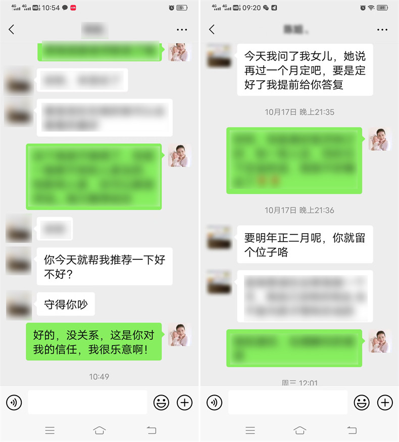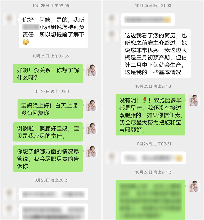 “之前有一位客户,是个年轻的妈妈,没有婆婆、没有妈妈,只有我帮忙带宝宝,宝妈就很依赖我,把我当成婆婆、妈妈,我能感觉到,她也在真正地把我当家人。服务结束后,她也给我介绍了新的客户。”