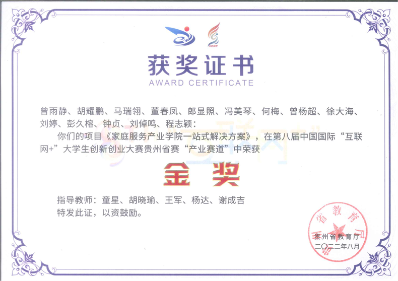 此前,由贵州省教育厅主办的第八届中国国际“互联网+”大学生创新创业大赛圆满落幕。贵州大学曾雨静、胡耀鹏等14名同学共同推送的“家庭服务产业学院一站式解决方案”项目,成功斩获贵州省省赛金奖。