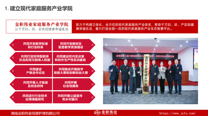 会上,谢玉琳教授就现代家庭服务产业体系、现代家庭服务与管理专业建设两部分作了主题分享。她提到,家政服务业作为新兴产业,对促进就业、精准脱贫、保障民生具有重要作用。“金职伟业作为一家专注家庭服务产业的企业,于去年正式建立了湖南省第一个家庭服务类产业学院——金职伟业家庭服务产业学院,以全方位服务母婴、幼儿、孕产妇、老人全生命周期健康照护。历时一年,金职伟业在产业学院建设、人才培养、资源建设等方面,均取得了优异成果。”