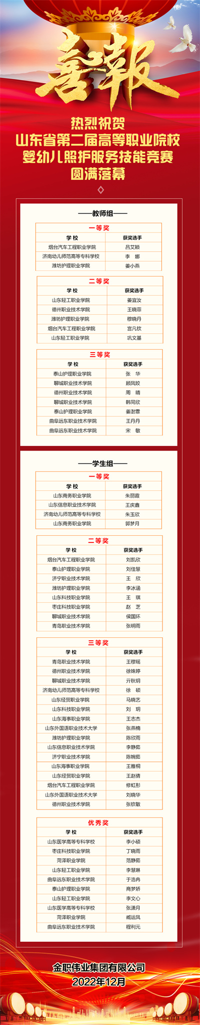 本届大赛的圆满落幕,再一次检验了山东省高等职业学校人才培养质量和办学水平,展现了当地师生的技能风采。未来,金职伟业将持续加大对技能大赛的支持力度,致力使幼儿照护赛项在全国各地落地开花,全面助推我国职业教育高质量发展。