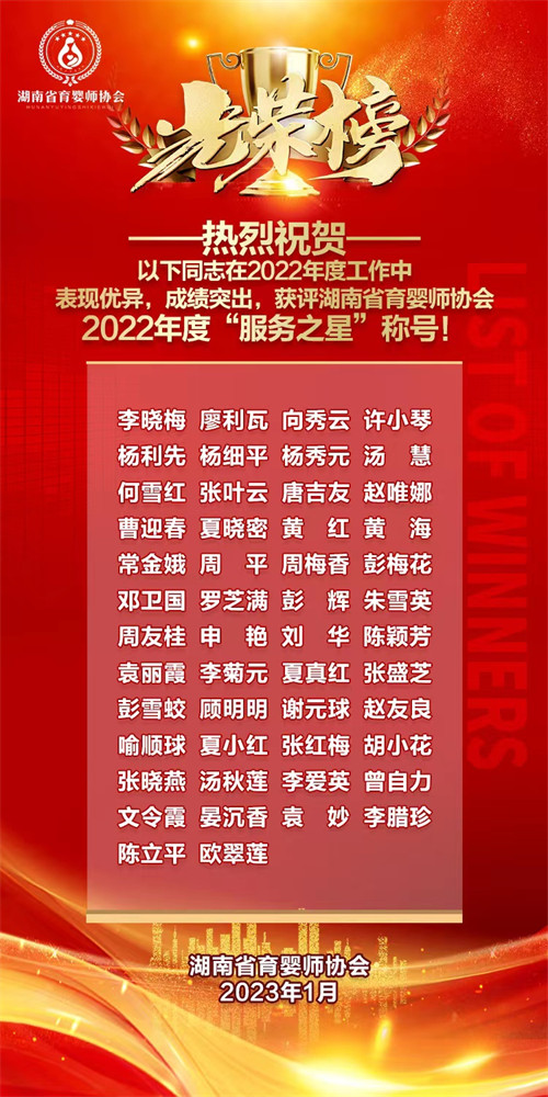 在气氛热烈的晚宴中,湖南省育婴师协会2023新春团拜会圆满结束。未来,湖南省育婴师协会将继续坚定初心,与广大育婴师携手并进,维护育婴师权益,促进育婴师成长;同时聚合各方力量,推动产业融合,助力育婴行业健康高质量发展。