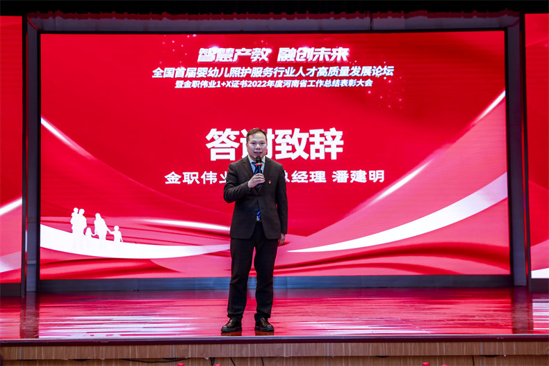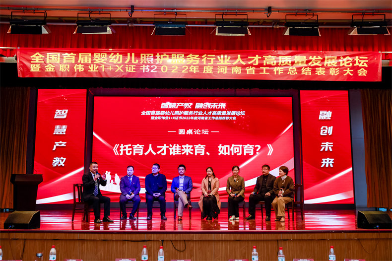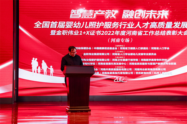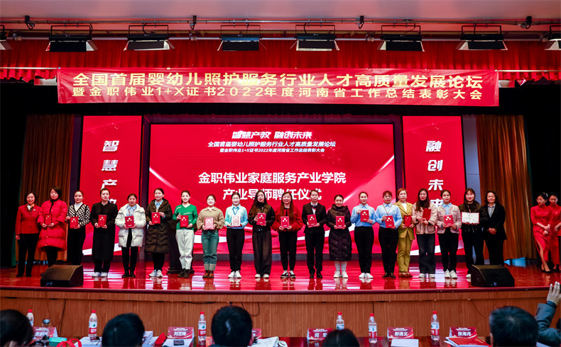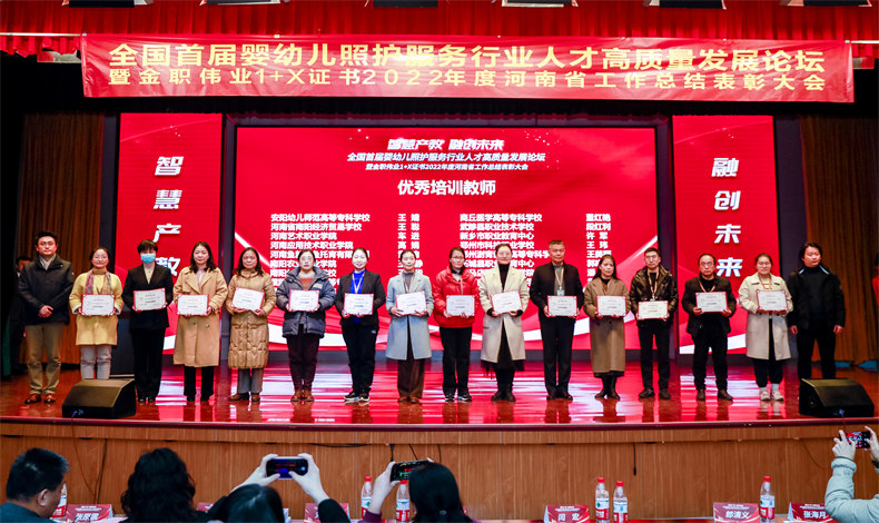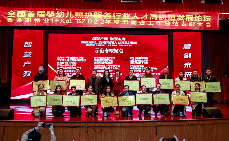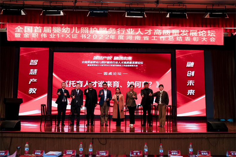 随着河南省首届托育职业技能竟赛的落幕,2月24日,在中国妇幼保健协会、中国健康促进基金会、河南省卫健委人口家庭处、河南省人口学会指导下,金职伟业联合河南省人口学会婴幼儿发展专业委员会,在河南郑州顺利开启“智慧产教 融创未来”全国首届婴幼儿照护服务行业人才高质量发展论坛暨金职伟业1+X证书2022年度工作总结表彰大会。