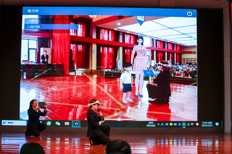 特别的是,开幕式上,金职伟业团队不仅以自主研发的智能仿真幼儿,进行海姆立克技能演示,还首次演示了婴幼儿照护全息智能化训练系统(MR)。该系统将幼儿照护8大能力模块、62个教学场景融入训练系统,并配套多端教学工具、教师管理系统、学生学习系统,搭配全体系MR实训课程,可实现内容互通、资源共享、数据分析。