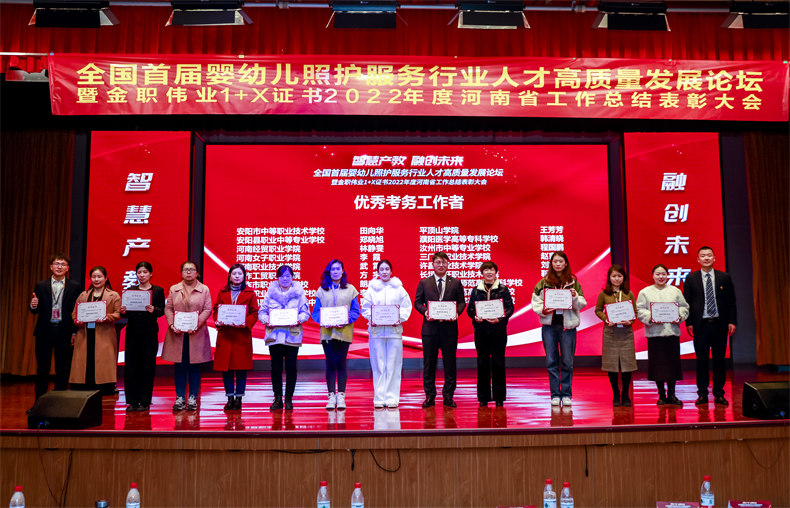 2022年,金职伟业累计培训河南省幼儿照护职业技能等级证书中、高级师资113人,考务技术与督导员43人,6639名学生参加1+X幼儿照护职业技能等级证书考试,6320人顺利取证,通过率达95.20%,高于全国平均水平。此次颁奖是表彰,更是激励与期待。金职伟业期待能聚合校企之力,共同推进幼儿照护专业技能人才培养,为填补百万托育行业人才缺口而努力,也期待各获奖单位和个人不忘初心、珍惜荣誉,在各自领域和工作岗位上继续踔厉奋发,走好新的“赶考路”。