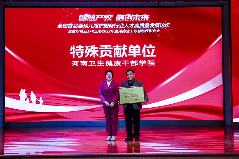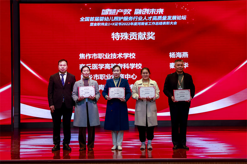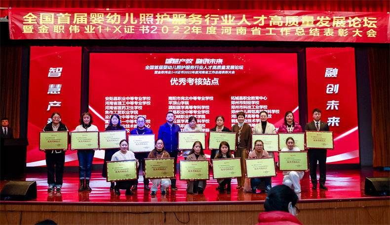 会上,揭晓了金职伟业1+X证书2022年度河南省示范考核站点、优秀考核站点、优秀实习就业单位、优秀培训教师、优秀考务工作者、特殊贡献奖及全国首届婴幼儿照护服务行业人才高质量发展论坛特殊贡献单位。同时,基于金职伟业在河南省托育职业技能竞赛所作出的突出贡献,河南省托育职业技能竞赛组委会办公室特别授予金职伟业“特殊贡献单位”荣誉称号。