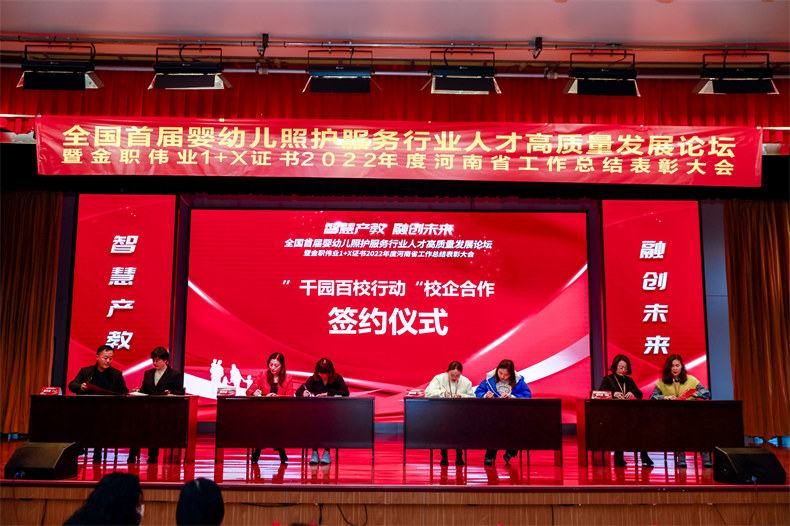 2月24日,在中国妇幼保健协会、中国健康促进基金会、河南省卫健委人口家庭处、河南省人口学会指导下,金职伟业与河南省人口学会婴幼儿发展专业委员会主办的“智慧产教 融创未来”全国首届婴幼儿照护服务行业人才高质量发展论坛暨金职伟业1+X证书2022年度工作总结表彰大会在河南郑州顺利开启。会上,金职伟业启动“千园百校”行动——河南省托育机构及职业院校校企合作签约仪式,21家院校与21家托育企业现场签约。