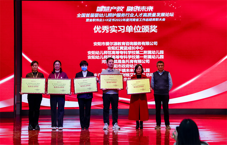 会上,金职伟业隆重表彰了2022年1+X幼儿照护、产后恢复职业技能等级证书推进过程中,做出重要贡献的优秀单位和优秀个人。其中,安阳市中等职业技术学校、河南经贸职业学院等30所院校获评示范考核站点,安阳县职业中等专业学校、河南省理工中等专业学校等24所院校获评优秀考核站点,安阳市爱尔源教育咨询服务有限公司、安阳红黄蓝成长中心等9个单位获评优秀实习单位,王婧、董红艳等18人获评优秀培训教师,田向华、郑晓旭等18人获评优秀考务工作者,杨海燕、秦爱华等4人获评特殊贡献奖。