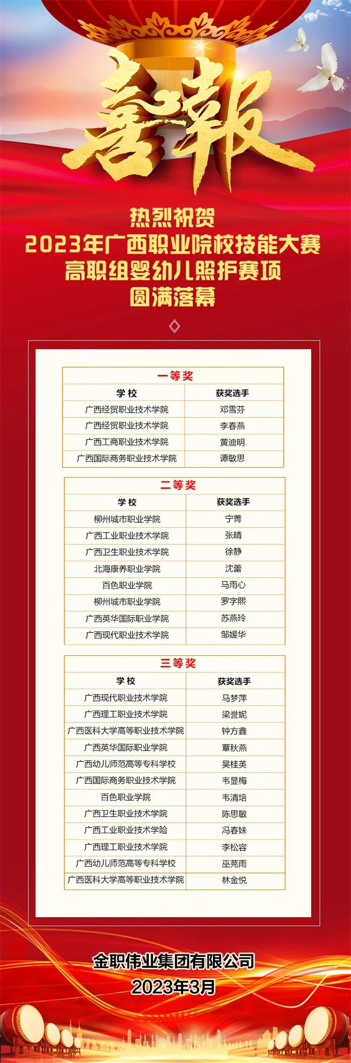 随着高职组竞赛的顺利落幕,2023年广西职业院校技能大赛中职组婴幼儿照护赛项也成功拉开帷幕。此次大赛是今年金职伟业助力河南省首届托育职业技能大赛后,再次携手院校开展的省级职业技能大赛,不仅为广大学子展示技能、切磋技艺提供了重要平台,也对壮大技能人才队伍、提升服务水平具有重要作用。未来,金职伟业将紧紧围绕婴幼儿照护技能人才队伍建设,积极传播“劳动光荣、技能宝贵、创造伟大”的时代风尚,广泛助力各省市开展婴幼儿照护相关技能大赛,为职业教育高质量发展贡献智慧和力量。