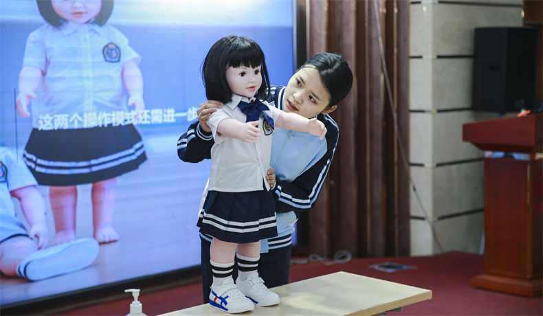 随后,所有管理干部们现场体验了金职伟业研发的智能仿真幼儿、婴幼儿照护全息智能化训练系统(MR)等智慧职教产品,并充分肯定了该产品在助力学生练习、实践、考评方面的作用。