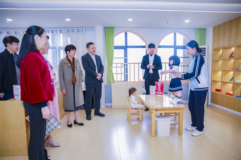 为进一步了解金职伟业在人才培养、校企合作等方面的工作情况,刘芳副主任一行先实地参观了金职伟业旗下的家庭服务产业学院、培训学校、产教融合型门店、托育综合服务中心,以及1+X幼儿照护、产后恢复实训基地,并现场体验了金职伟业研发的智能仿真幼儿、婴幼儿照护全息智能化训练系统(MR)等智慧职教产品。