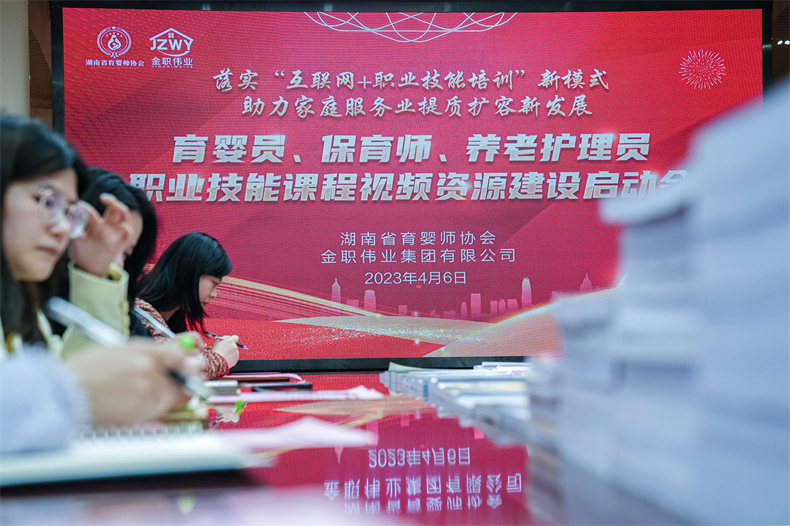 作为湖南省社会培训评价机构职业技能等级认定试点单位,湖南省育婴师协会与金职伟业集团有限公司一直致力于行业标准、教材及课程资源建设,组织开发制定国家标准2个、湖南省地方标准8个,编写出版1+X幼儿照护、产后恢复职业教育课证融通教材共计50余本。自2022年12月起,湖南省育婴师协会与金职伟业集团决定启动课程视频资源建设,目前样片已拍摄完成。后续,湖南省育婴师协会和金职伟业将以本次会议为起点,继续大力推动视频课程资源建设,以推动“互联网+职业技能培训”创新发展,推进行业高质量人才培养,助力家庭服务业提质扩容。