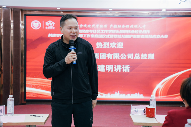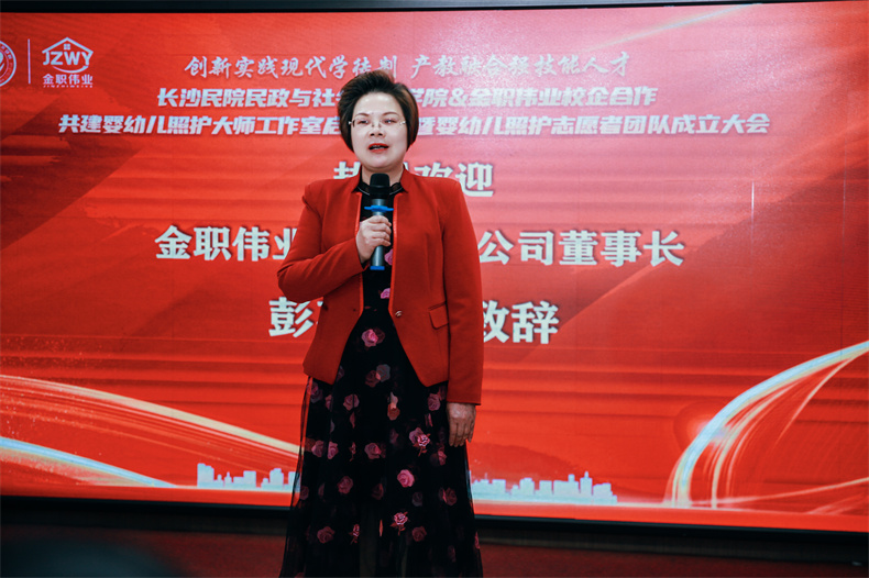 随后,金职伟业董事长彭英以“四个优势”“五个保障”,对婴幼儿照护大师工作室发展提出了具体要求,“我们有一流的团队和一流的技术,要打造一流的品质和一流的服务;我们将全力为大师工作室提供经费、场地、设备、活动保障,更期望获得质量与成果保障。”“大师工作室的成员应脚踏实地、真抓实干,共同推动大师工作室做深做实,做出成果、做成标杆,帮助学生在行业中创造更多价值。”