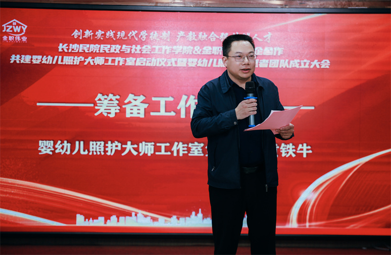 会议伊始,长沙民政职业技术学院民政与社会工作学院副院长沈宏格率先致辞。他主要分享了三点内容:一是感谢,感谢金职伟业在学院专业教学、办学等方面给予的大力支持;二是责任,各位大师工作室的老师应主动肩负起自身职责使命,将婴幼儿照护师资团队建设好,努力打造工作室特色品牌;三是期望,期望学院和金职伟业能携手共进,结出更多硕果,助力行业发展。